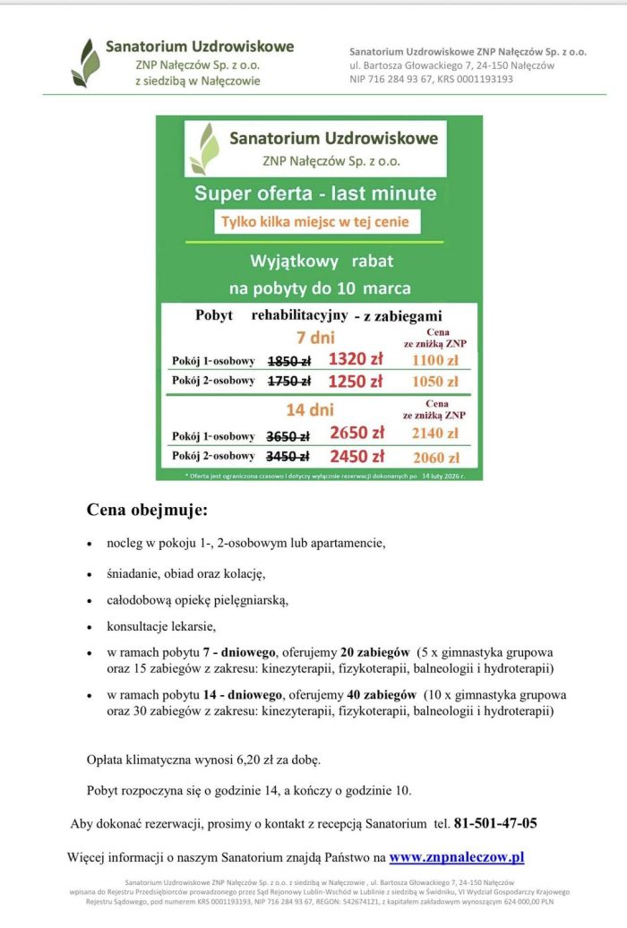 zapraszamy Was do skorzystania ze specjalnej oferty last minute na pobyty w Sanatorium Uzdrowiskowym ZNP w Nałęczowie.